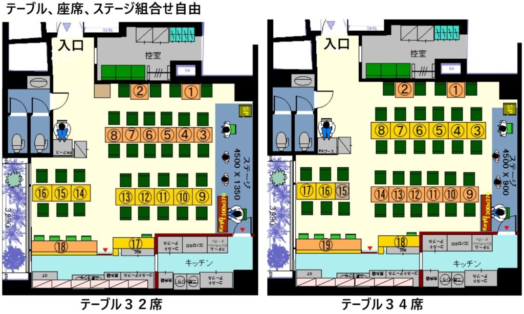 テーブル32席、カンター5席、ステージスペース可変式。